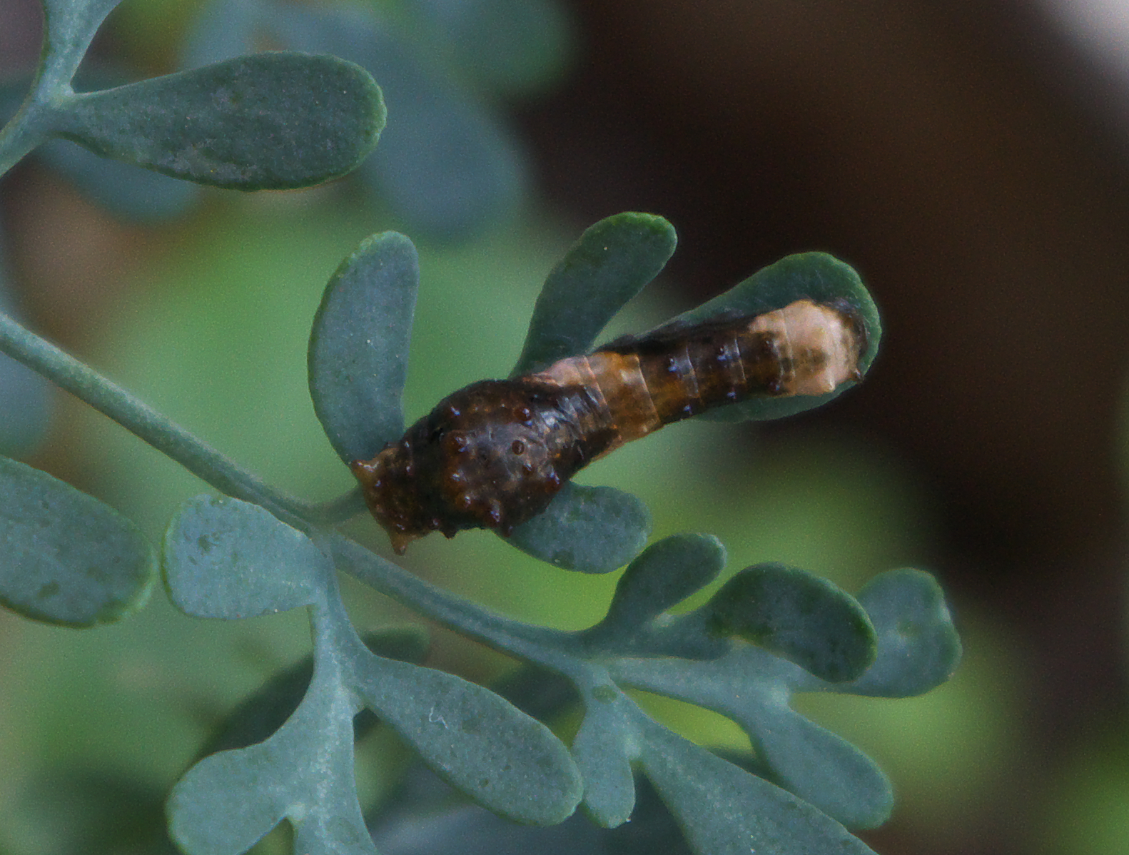 There is another caterpillar munching on the rue and growing. It is about .5 ", 1.25 cm long right now. It had doubled in size since Tuesday. We may get to watch two giant swallowtails go through metamorphosis.